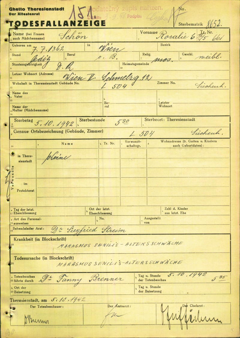 Schön Rosalie: Death certificate, Ghetto Terezín