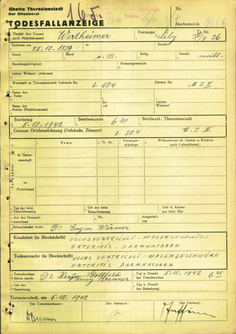 Wertheimer Cäcilie: Death certificate, Ghetto Terezín