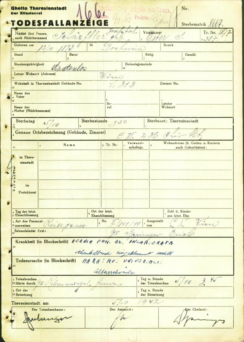 Schäftler Ester Marjem: Death certificate, Ghetto Terezín