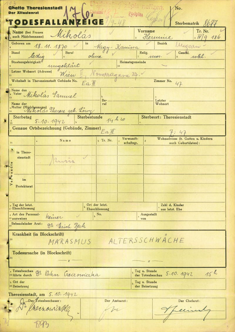 Mikolas Hermine: Death certificate, Ghetto Terezín