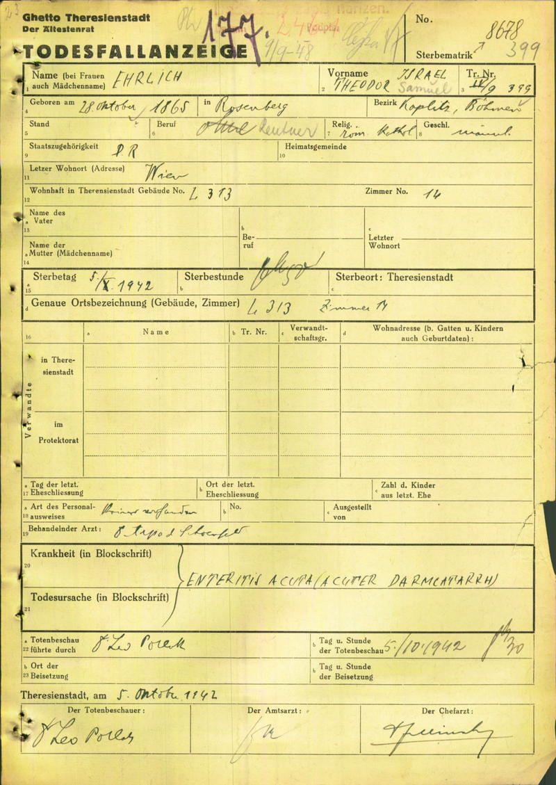Ehrlich Theodor Samuel: Death certificate, Ghetto Terezín