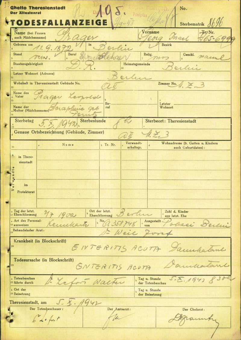 Prager Georg: Death certificate, Ghetto Terezín