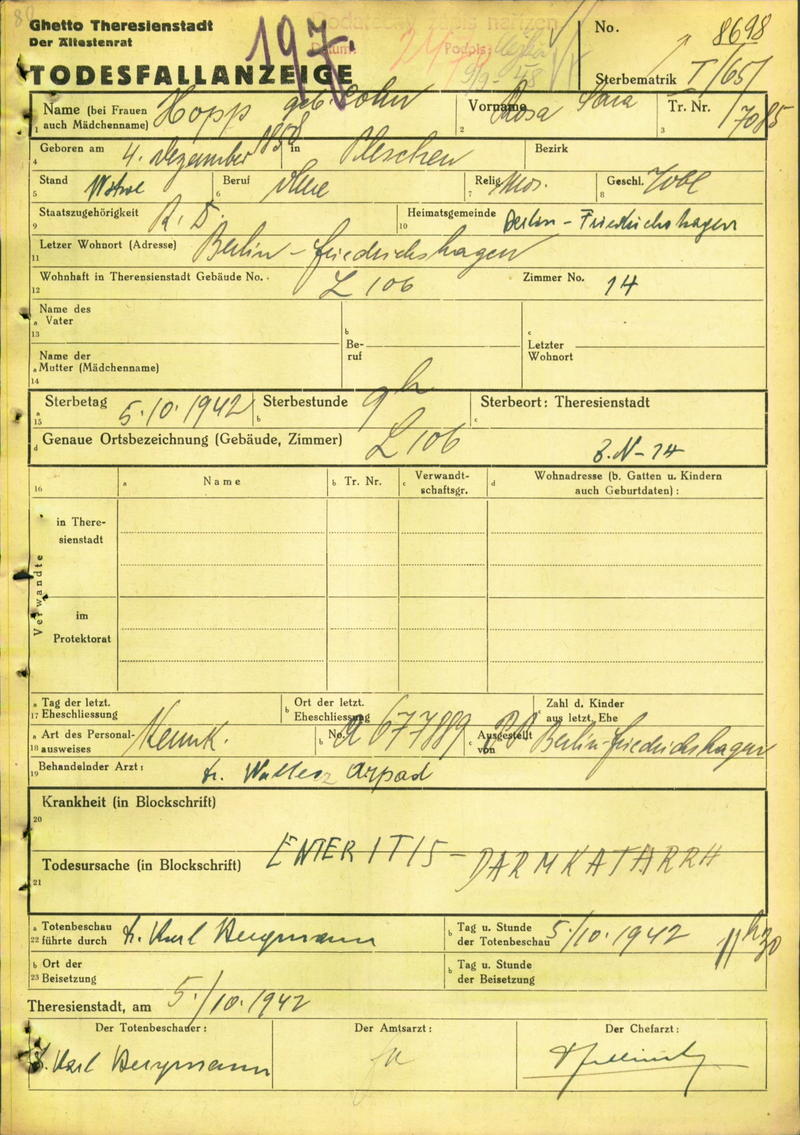 Hopp Rosa: Death certificate, Ghetto Terezín