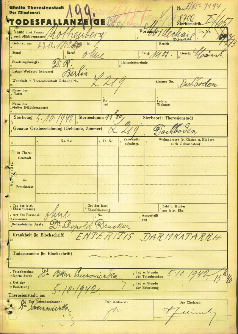 Rothenberg Moritz: Death certificate, Ghetto Terezín