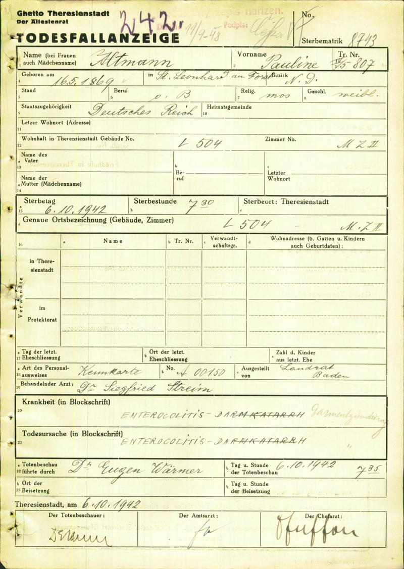 Altmann Pauline: Death certificate, Ghetto Terezín