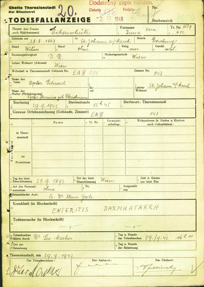 Eibenschütz Irma: Death certificate, Ghetto Terezín