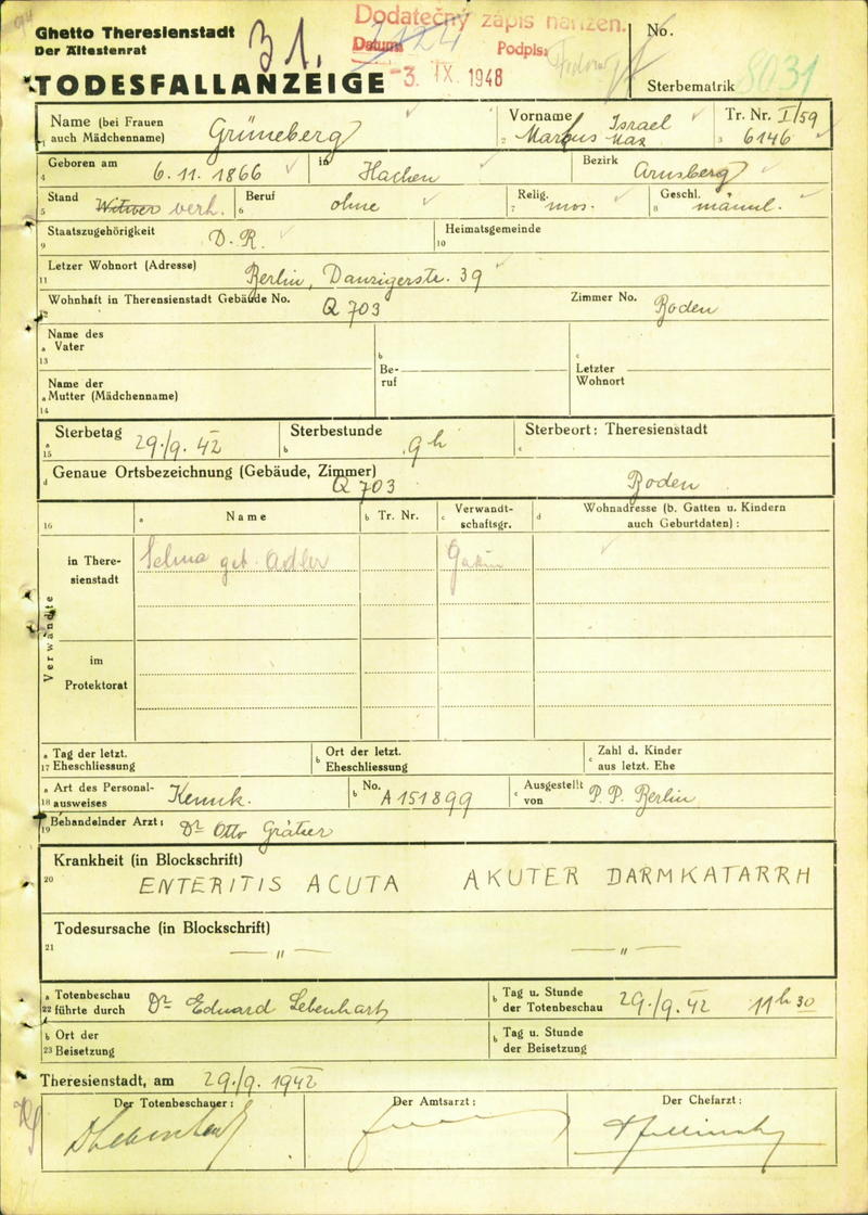 Grüneberg Marcus: Death certificate, Ghetto Terezín