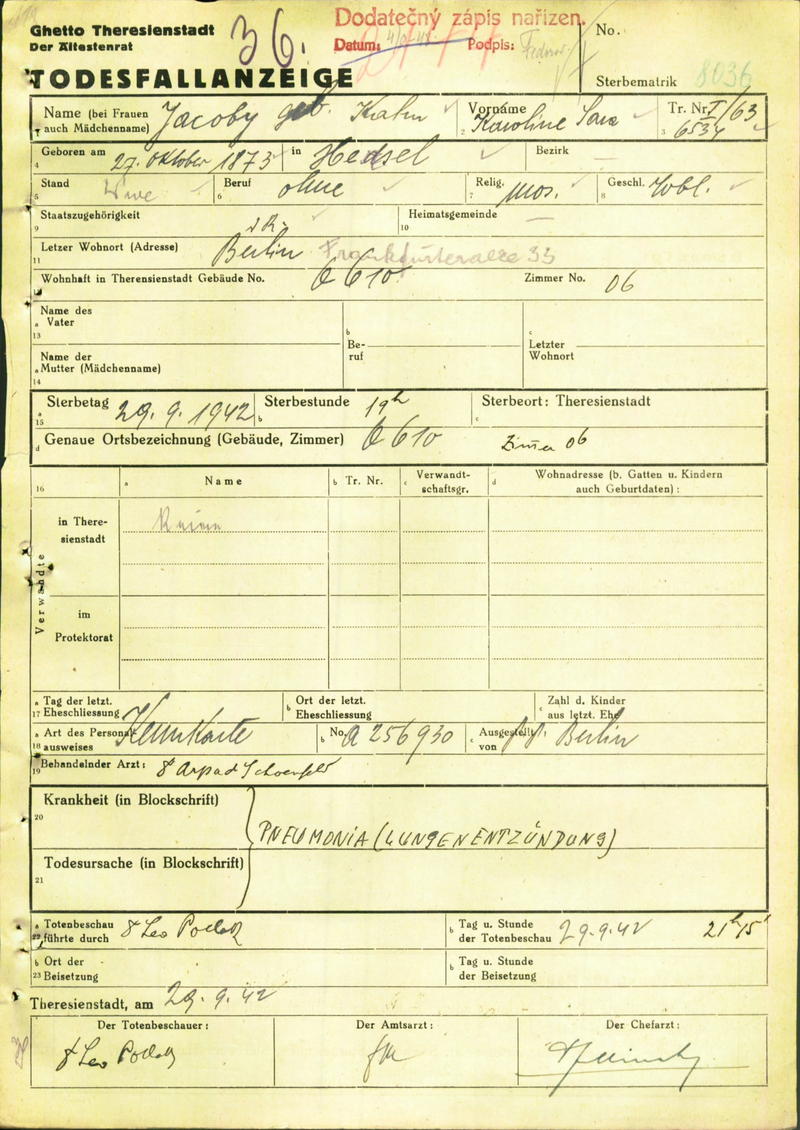 Jacoby Karoline: Death certificate, Ghetto Terezín