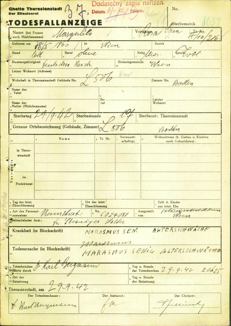 Margulies Rosa: Death certificate, Ghetto Terezín