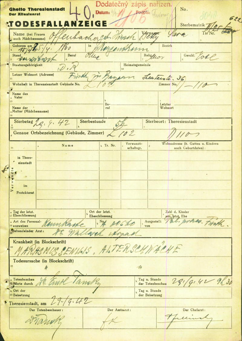 Offenbacher Betty: Death certificate, Ghetto Terezín
