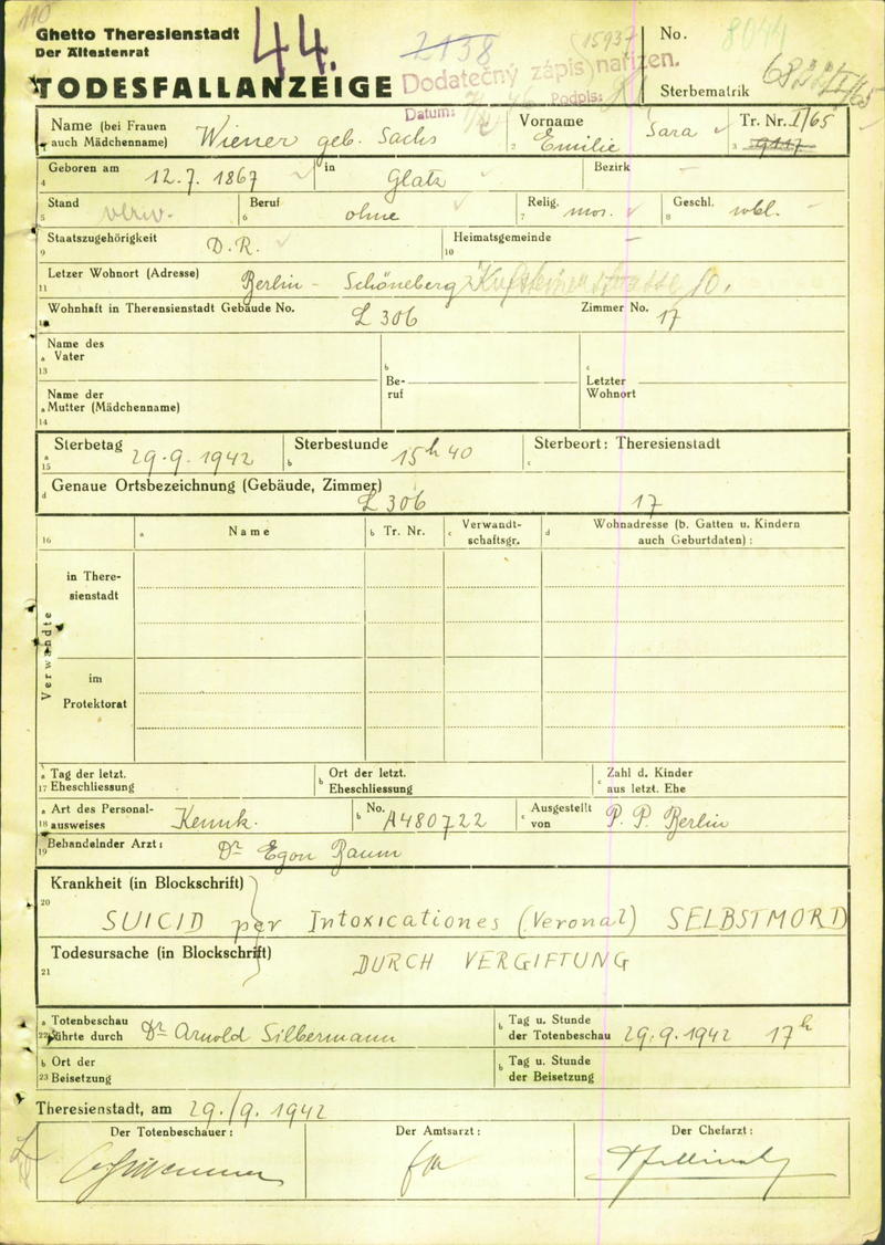 Wiener Emilie: Death certificate, Ghetto Terezín