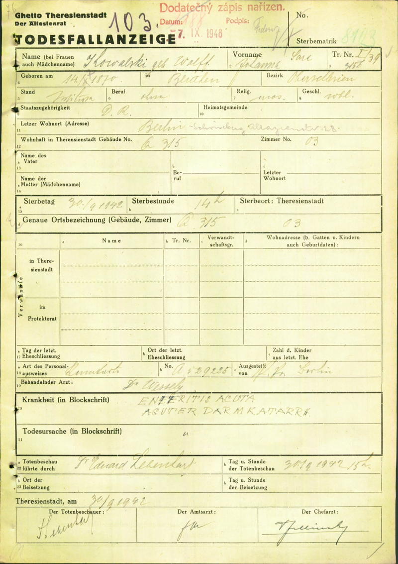 Kowalski Johanna: Death certificate, Ghetto Terezín