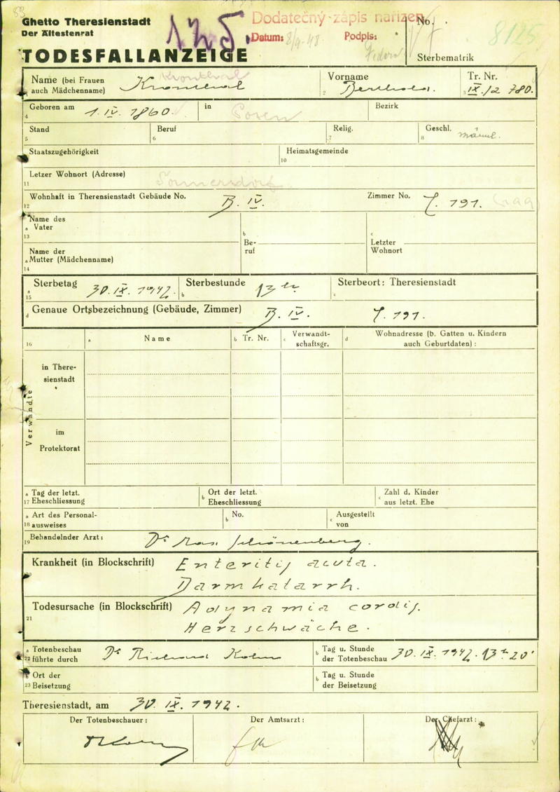 Kronthal Berthold: Death certificate, Ghetto Terezín