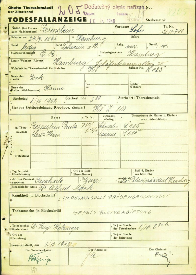 Rosenstein Sofie: Death certificate, Ghetto Terezín