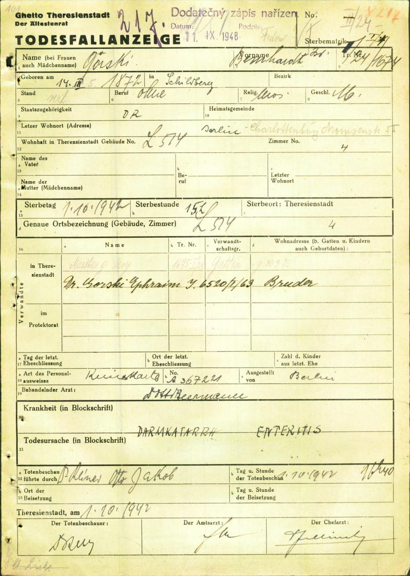 Gorski Bernhard: Death certificate, Ghetto Terezín
