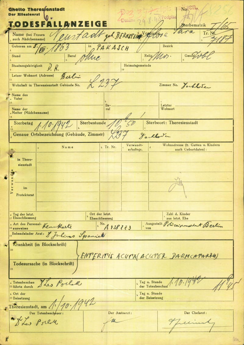 Neustadt Flora: Death certificate, Ghetto Terezín
