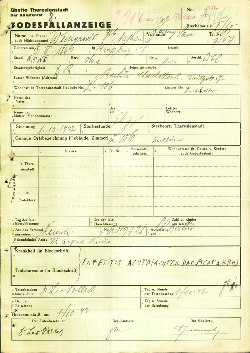 Weingart Fanny: Death certificate, Ghetto Terezín