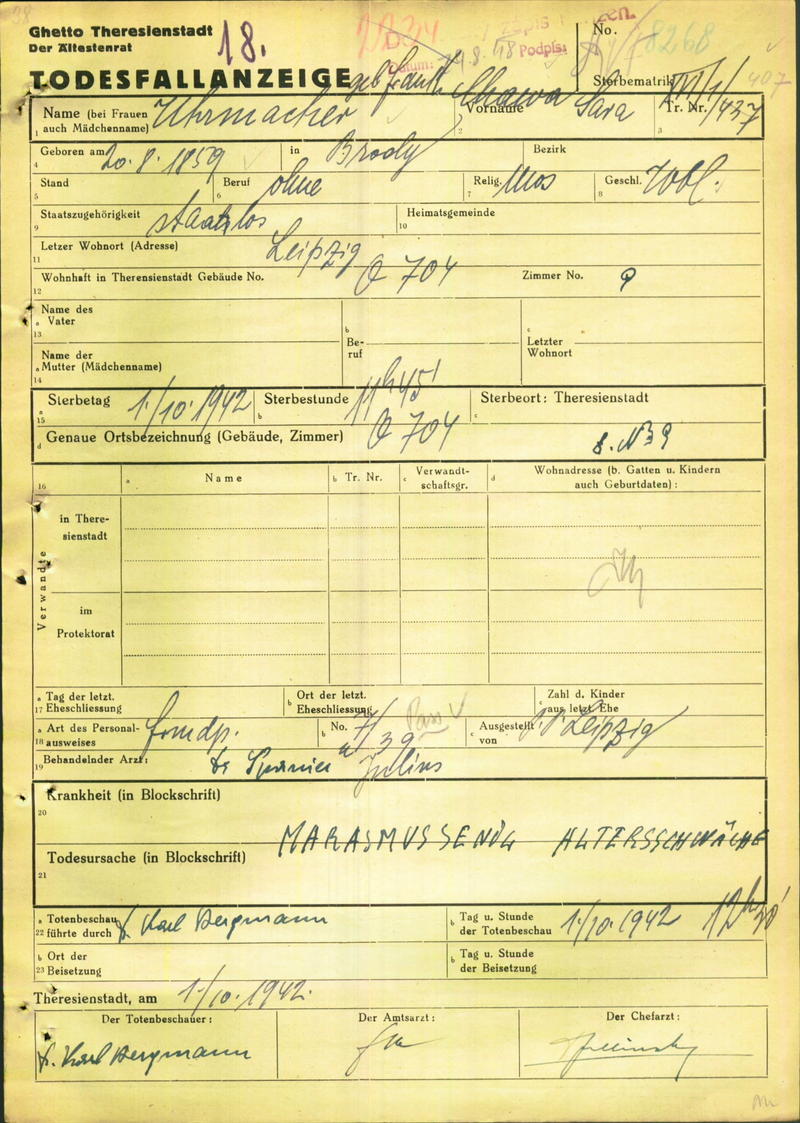 Uhrmacher Chawa: Death certificate, Ghetto Terezín