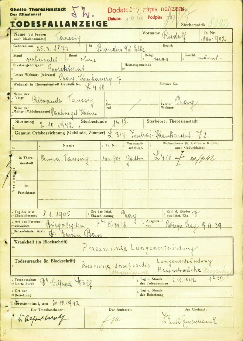 Taussig Rudolf: Death certificate, Ghetto Terezín