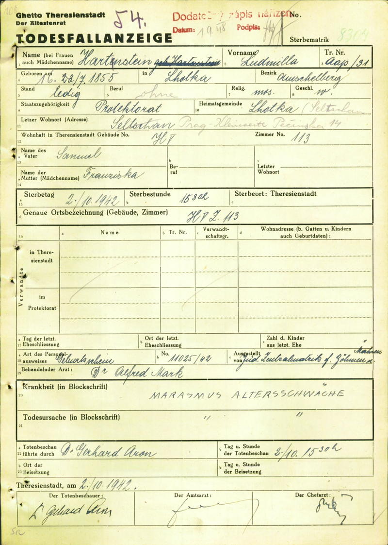 Hartensteinová Ludmila: Death certificate, Ghetto Terezín