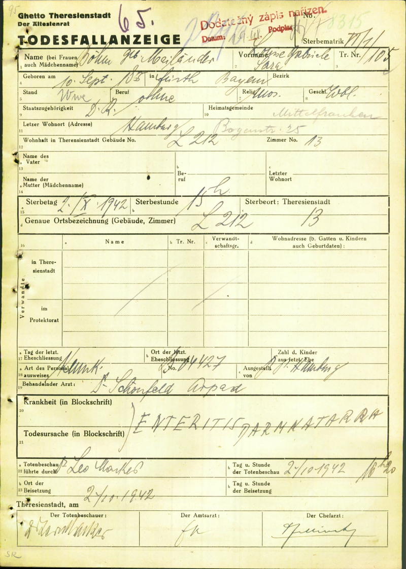 Böhm Louise Gabriele: Death certificate, Ghetto Terezín