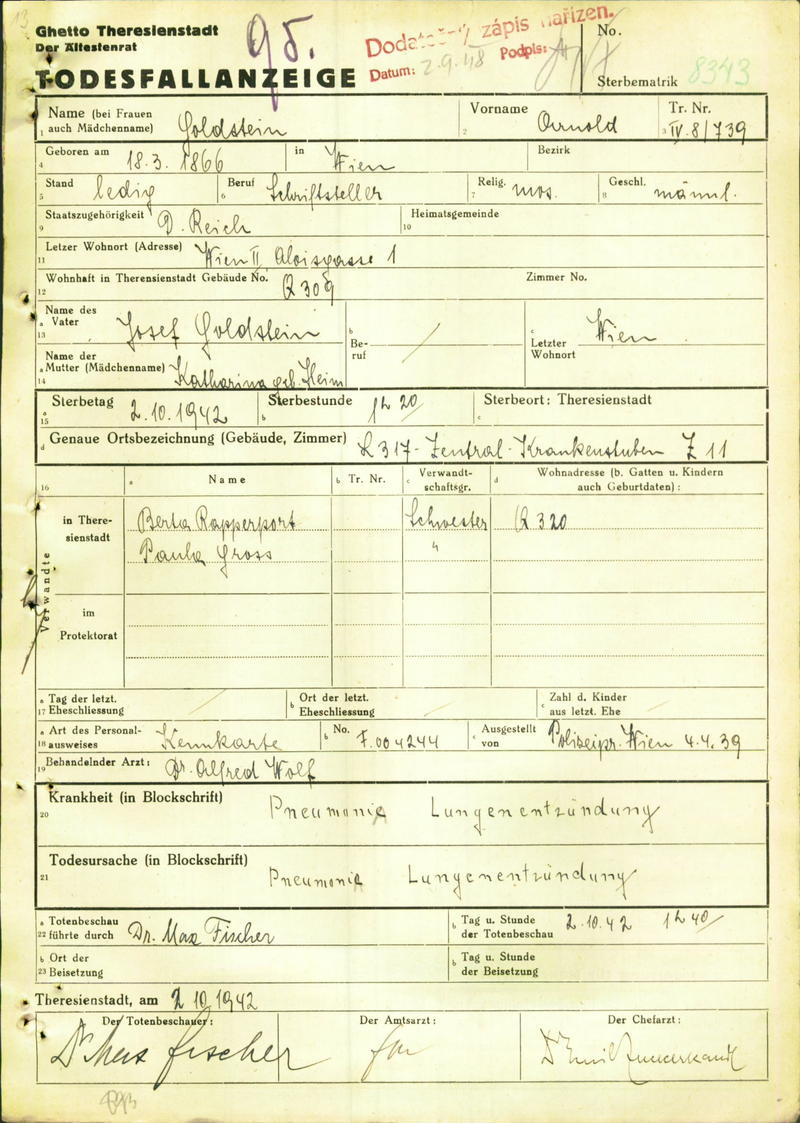 Goldstein Arnold: Death certificate, Ghetto Terezín