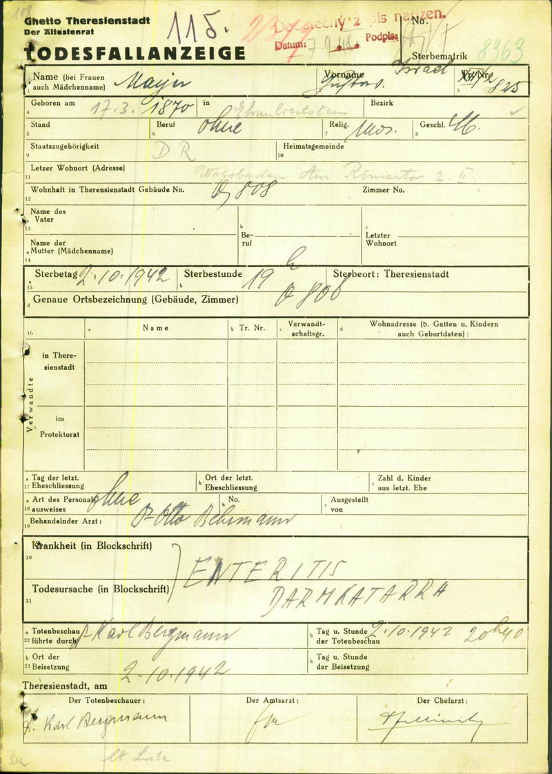 Meyer Gustav: Death certificate, Ghetto Terezín
