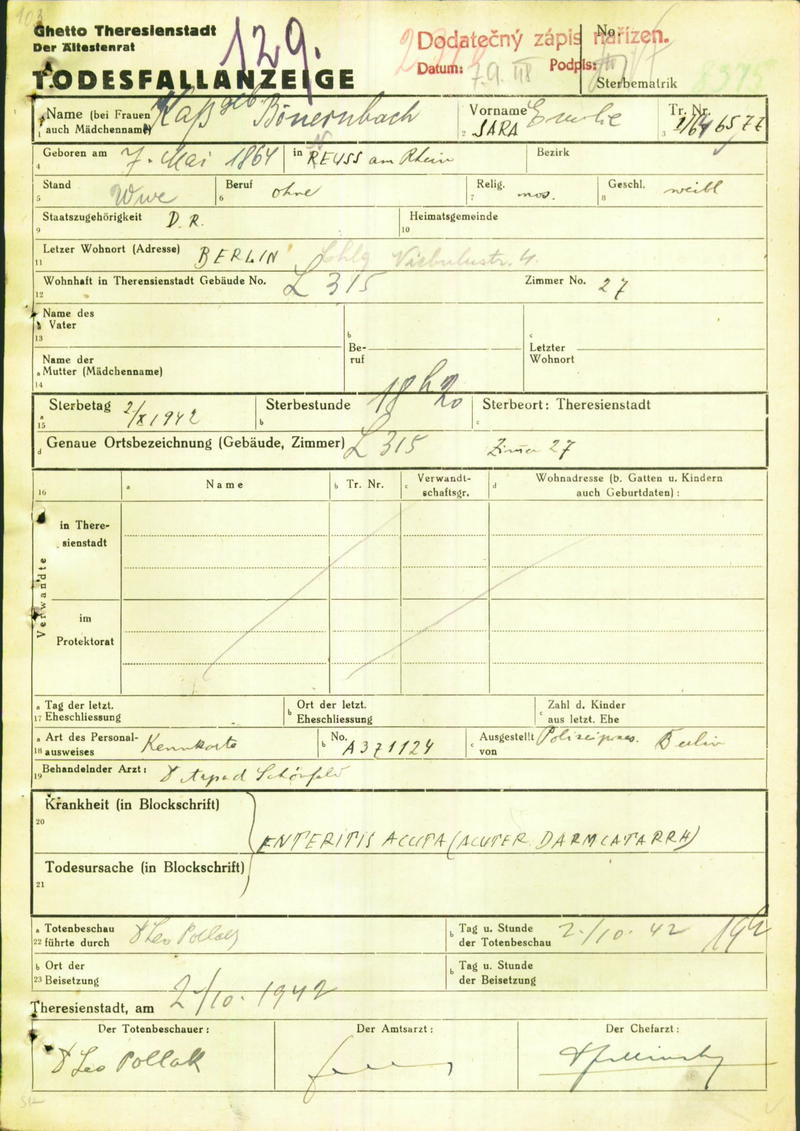 Kass Emilie: Death certificate, Ghetto Terezín