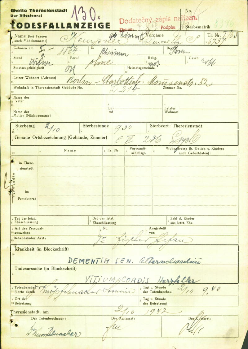 Kempner Henriette: Death certificate, Ghetto Terezín