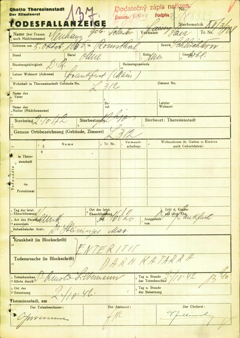 Neuhaus Fanny: Death certificate, Ghetto Terezín