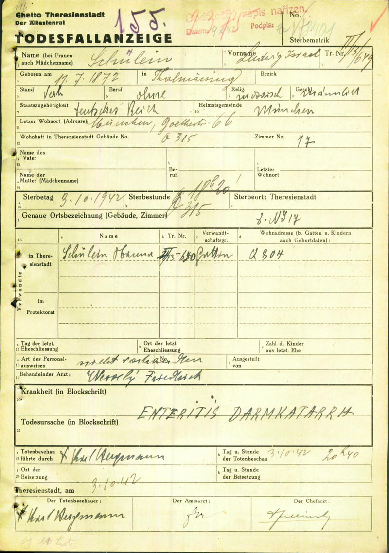 Schülein Ludwig: Death certificate, Ghetto Terezín