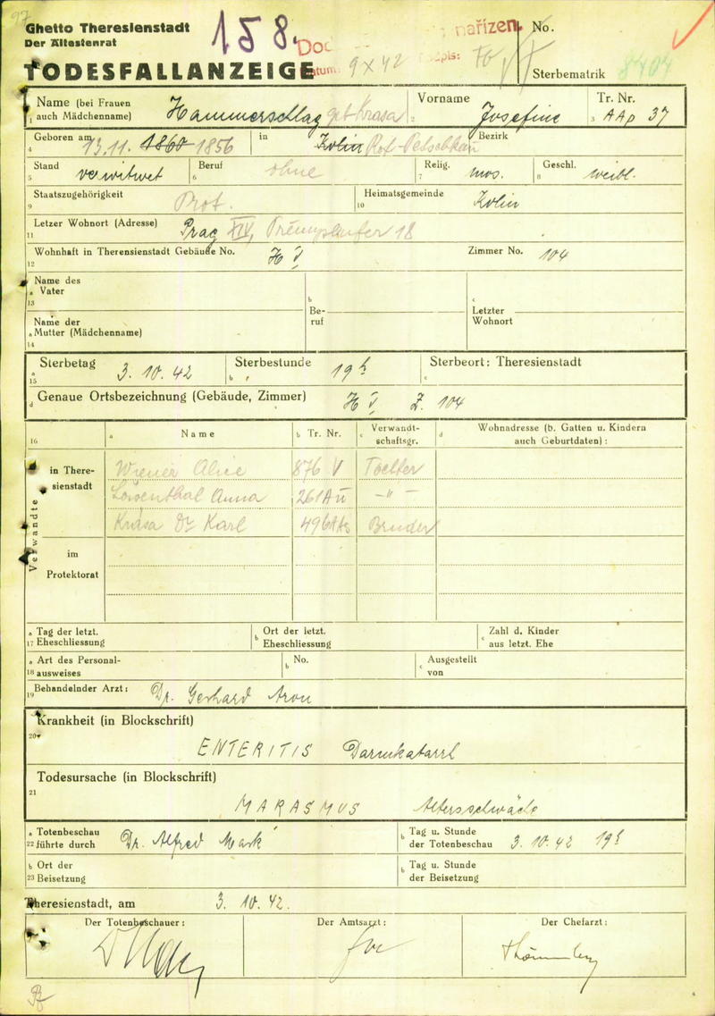 Hammerschlagová Josefina: Death certificate, Ghetto Terezín