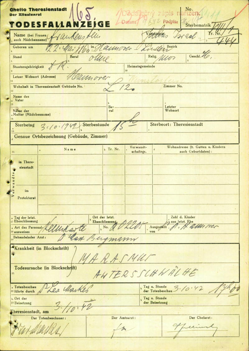 Frankenstein Julius: Death certificate, Ghetto Terezín
