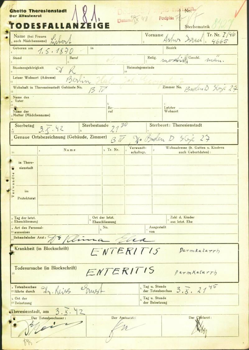 Liebert Arthur: Death certificate, Ghetto Terezín