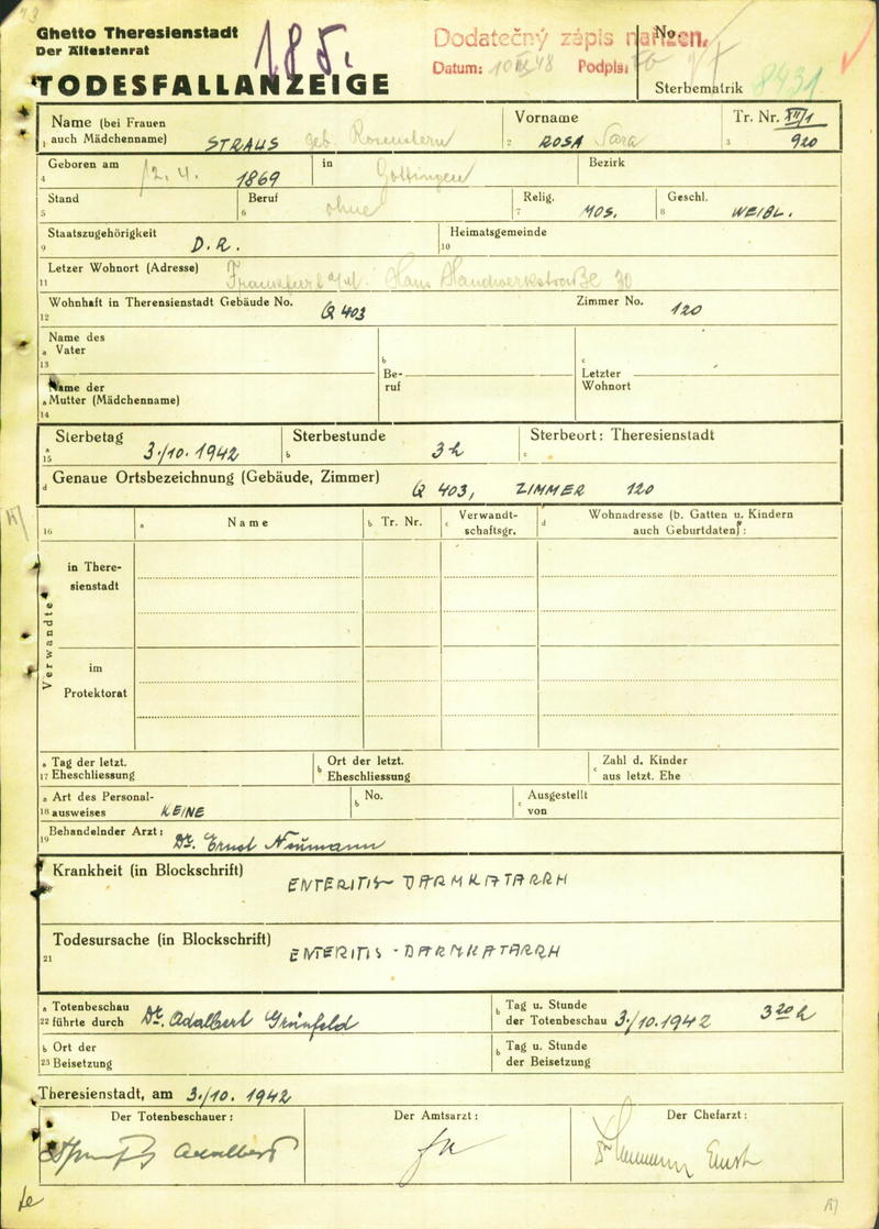 Strauss Rosa: Death certificate, Ghetto Terezín