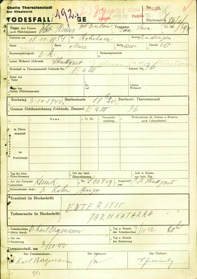 Strauss Ida: Death certificate, Ghetto Terezín