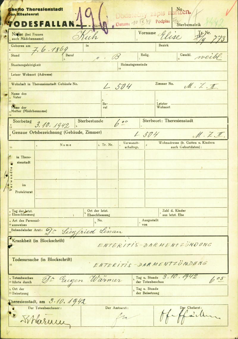 Kuh Elise: Death certificate, Ghetto Terezín