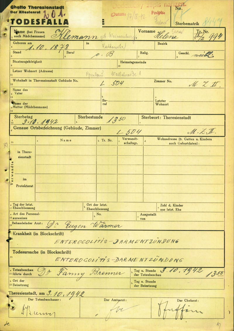 Kleemann Helene: Death certificate, Ghetto Terezín