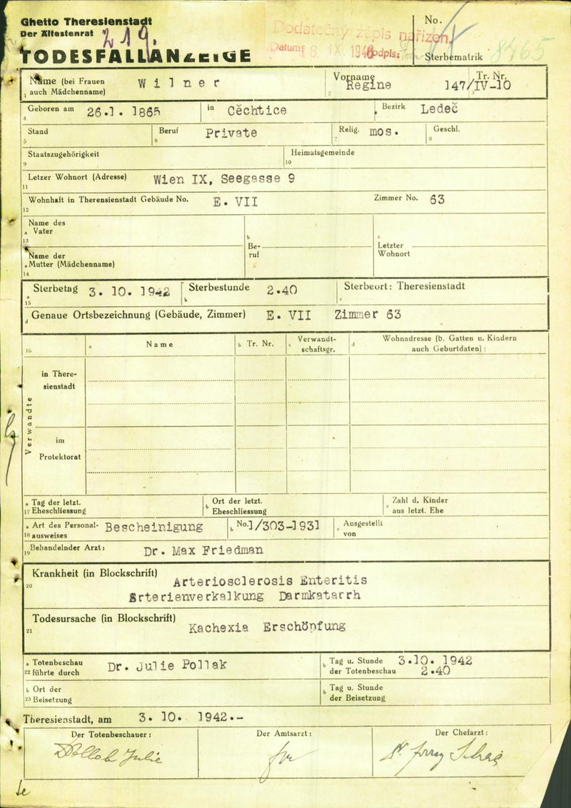 Willner Regina: Death certificate, Ghetto Terezín