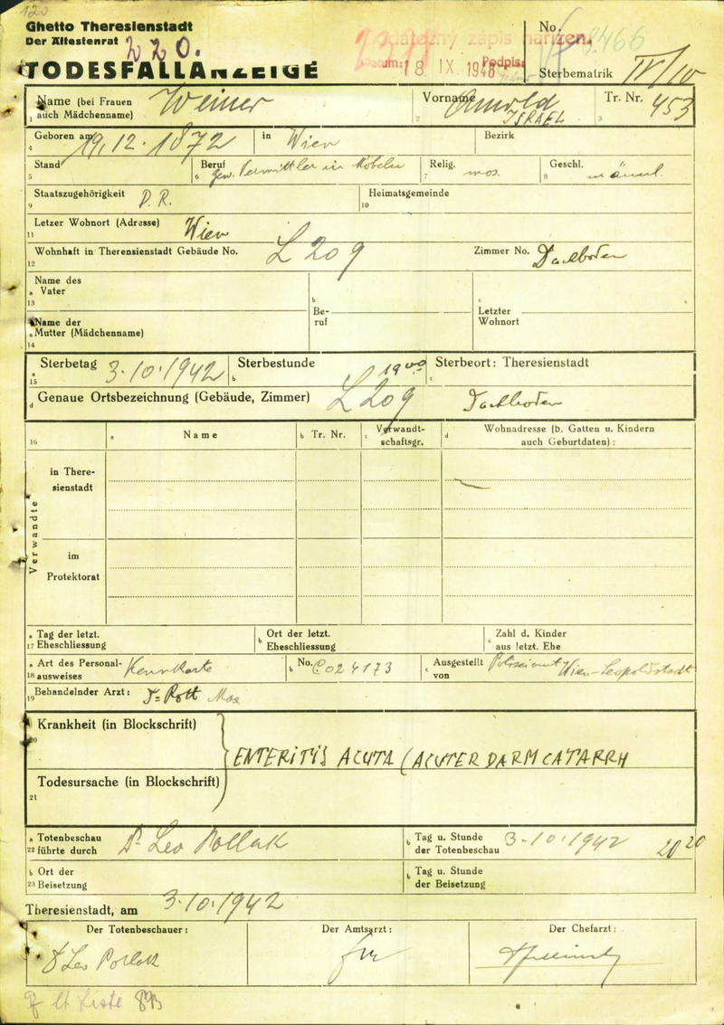 Weiner Arnold: Death certificate, Ghetto Terezín