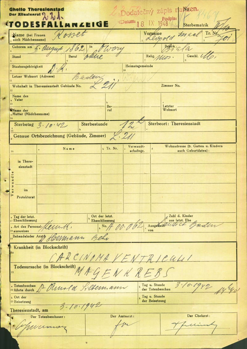 Rossett Leopold: Death certificate, Ghetto Terezín