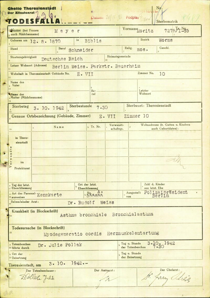 Mayer Moritz: Death certificate, Ghetto Terezín