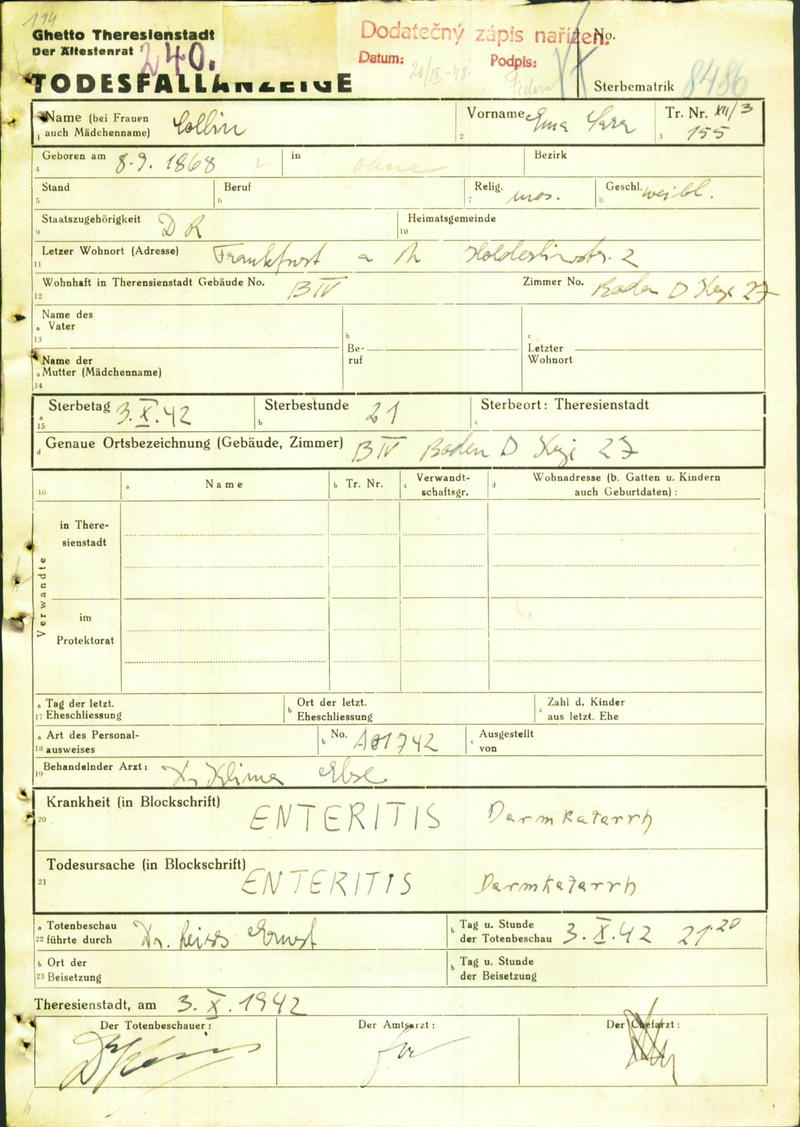 This database contains the names and fates of those who were deported from the territory of today’s Czech Republic, be it their homeland or may they have been deported to the Theresienstadt ghetto before from different european countries. Further, it contains basic information on those men, women and children, most of whom were Roma or Sinti, who died as prisoners of the so-called „Gypsy camp I“ Lety u Písku.