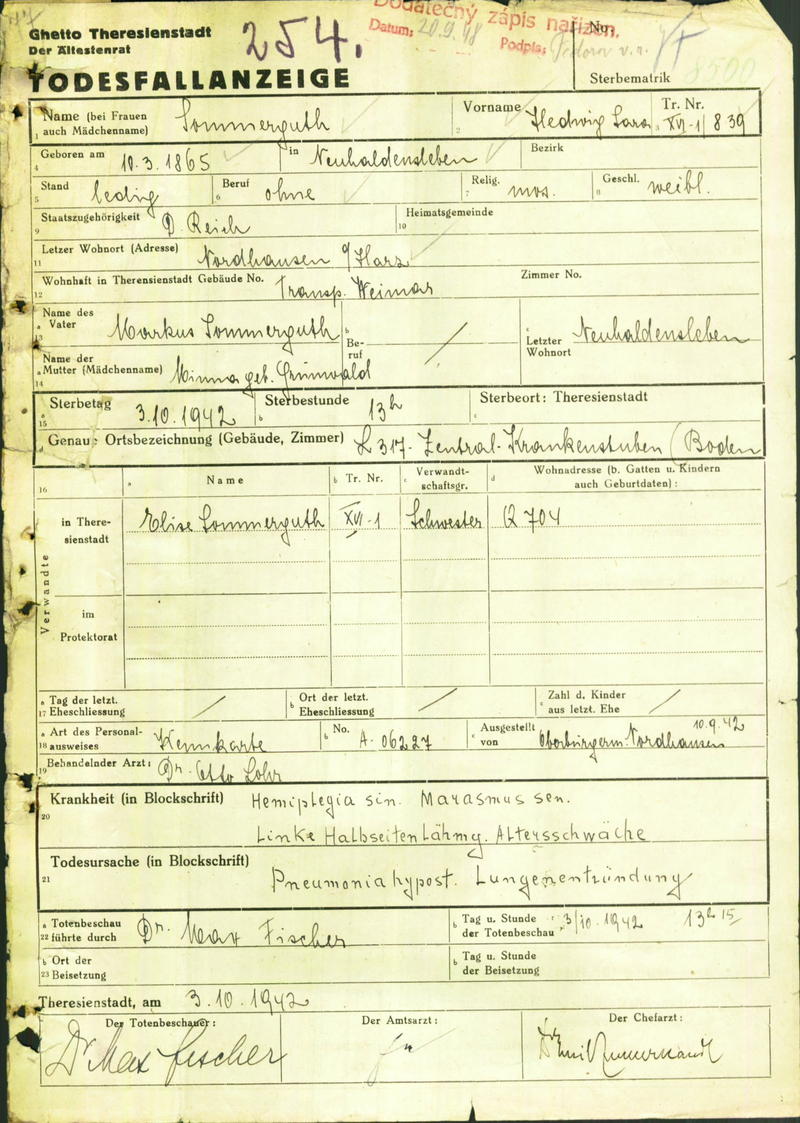 Sommerguth Hedwig: Death certificate, Ghetto Terezín
