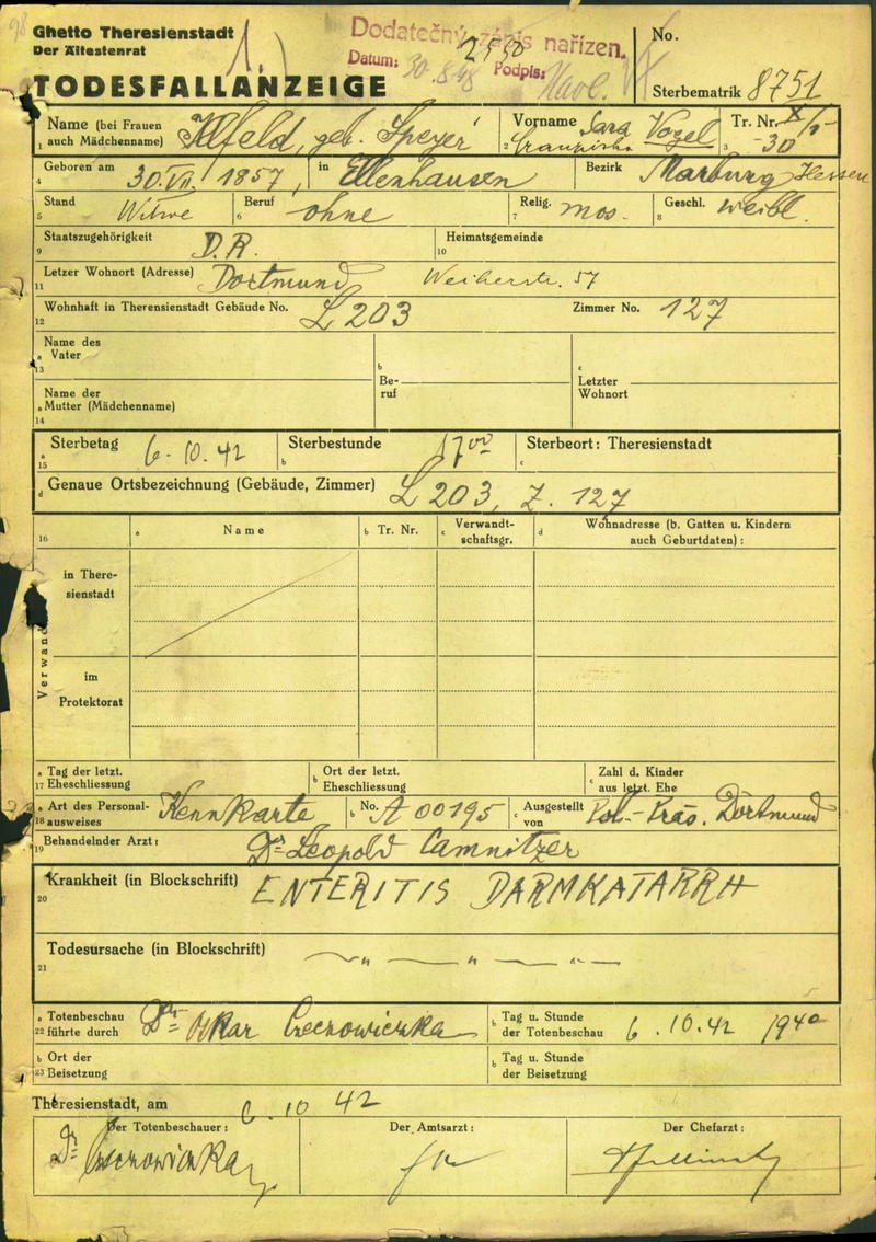 Illfeld-Vogel Franziska: Death certificate, Ghetto Terezín