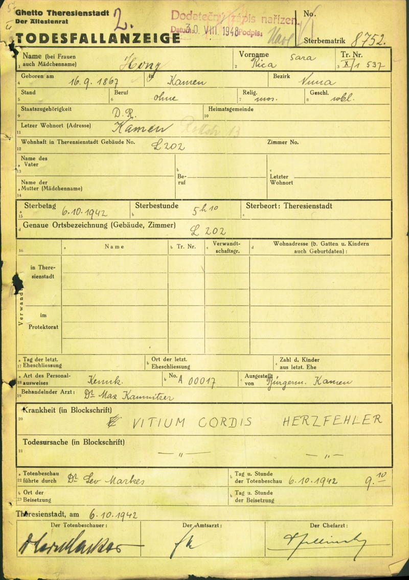 Hony Ricka: Death certificate, Ghetto Terezín