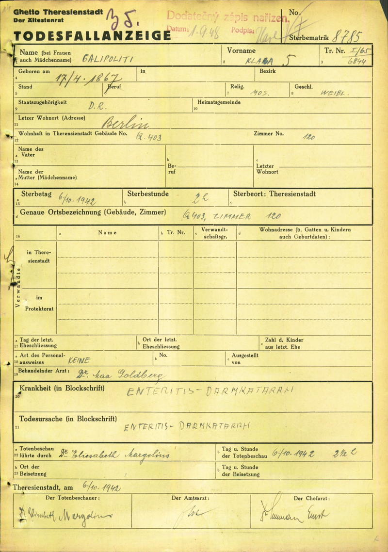 Galipoliti Klara: Death certificate, Ghetto Terezín