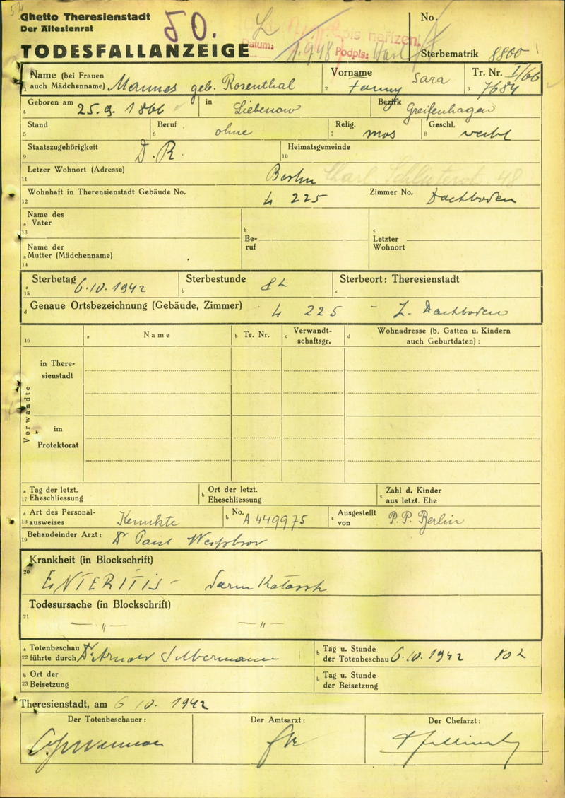 Mannes Franziska: Death certificate, Ghetto Terezín