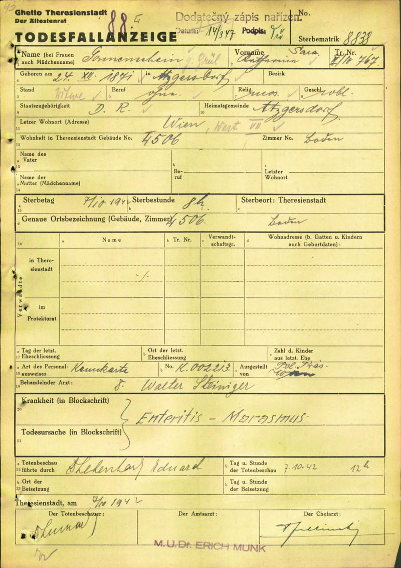 Sonnenschein Katharina: Death certificate, Ghetto Terezín