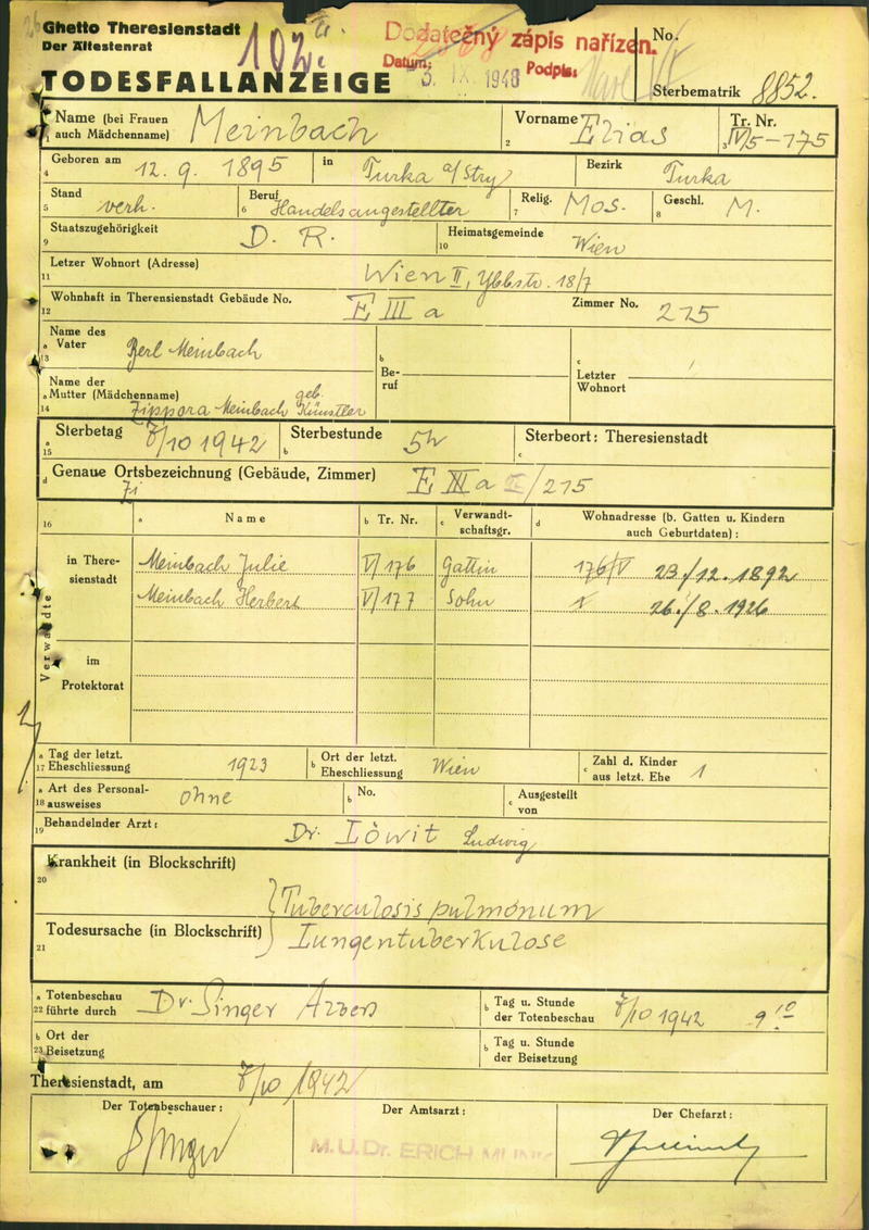 Meinbach Elias: Death certificate, Ghetto Terezín